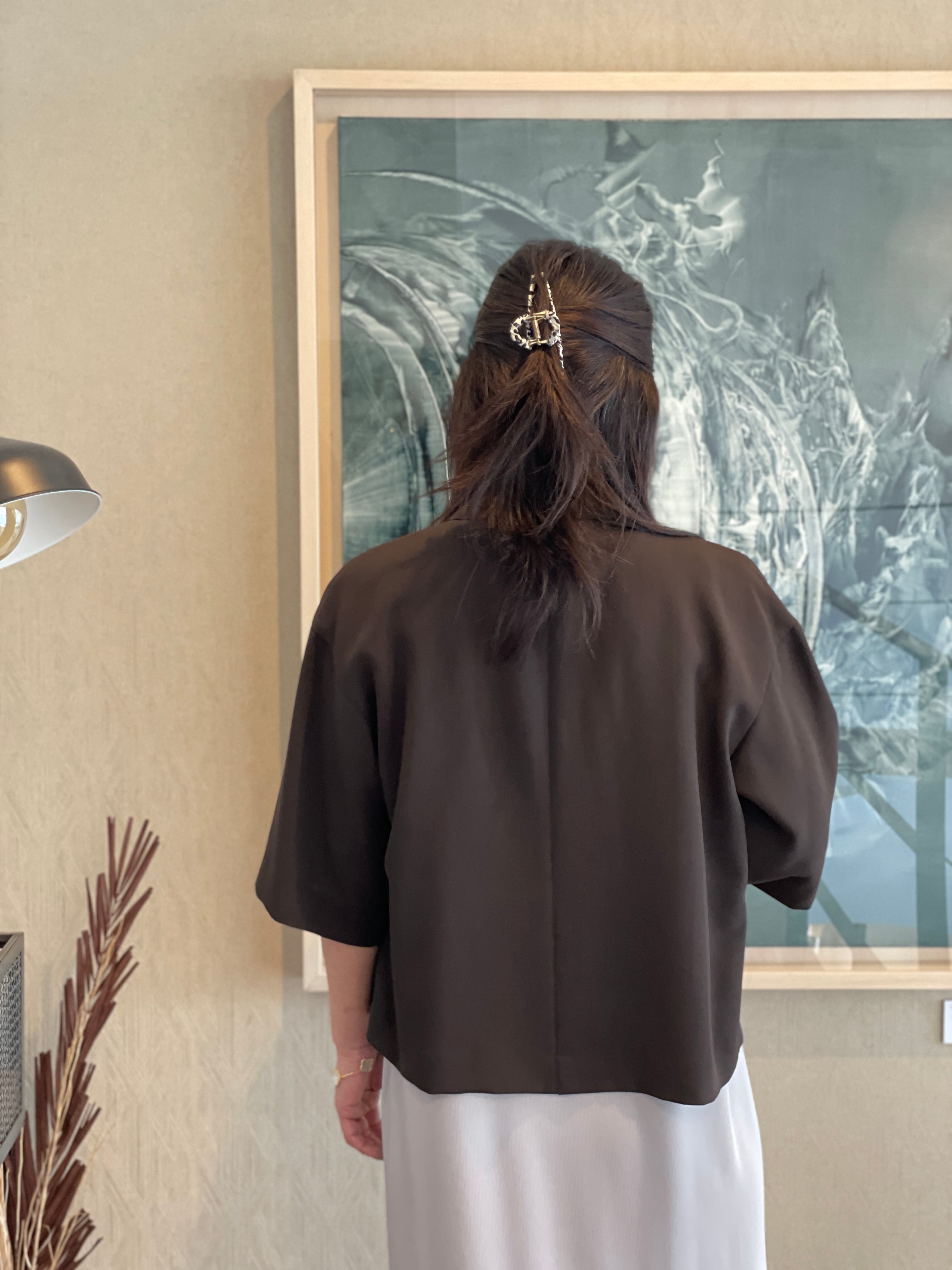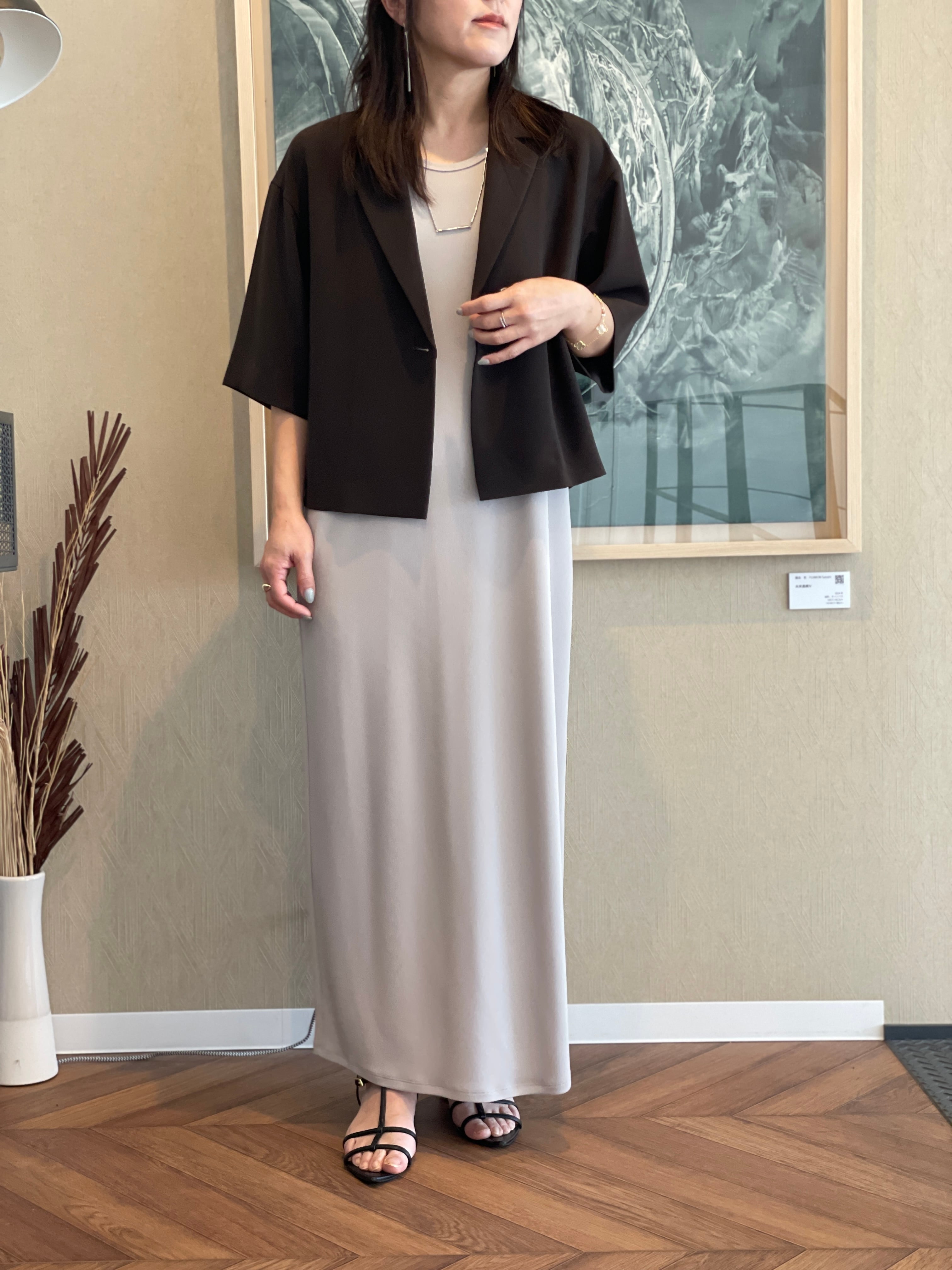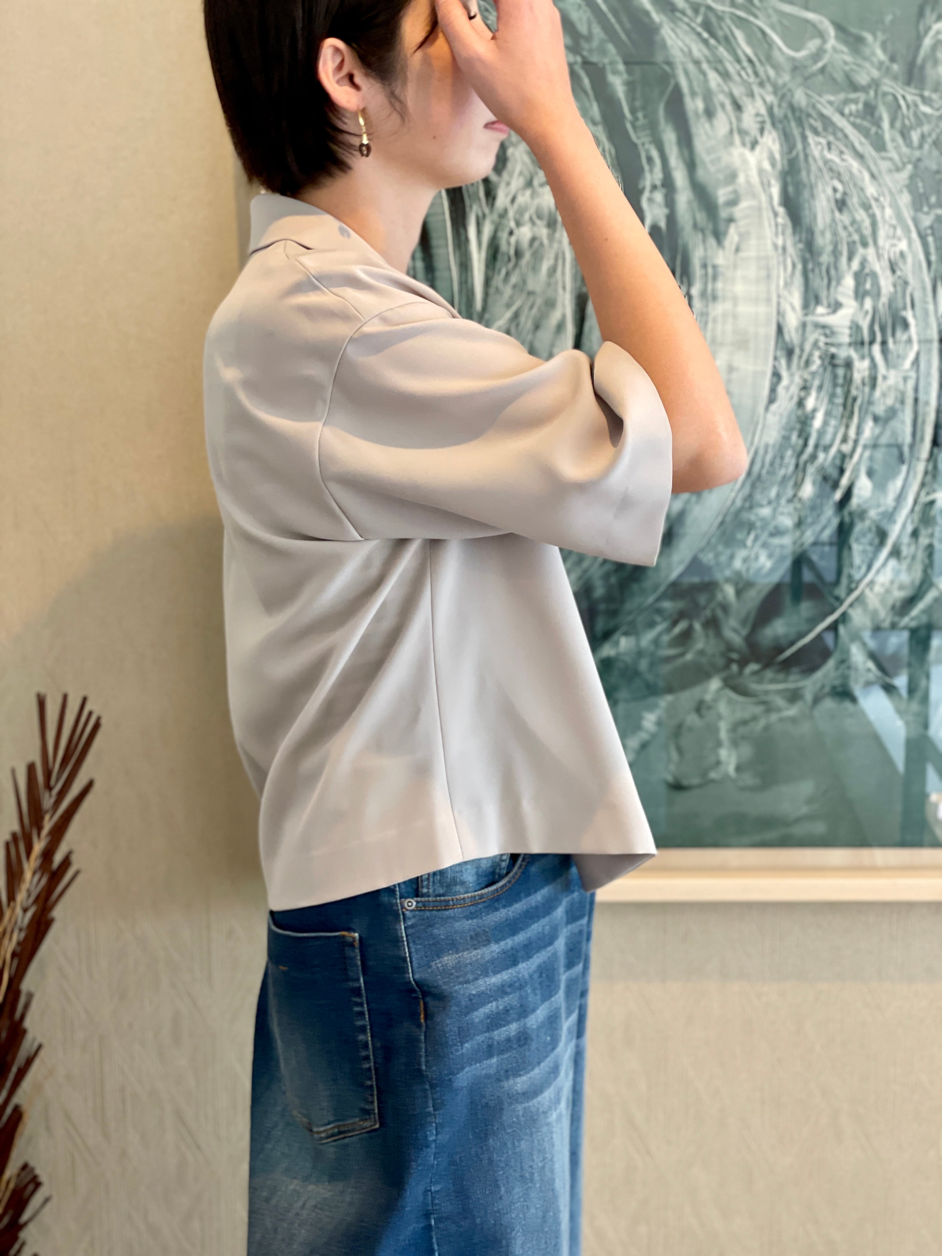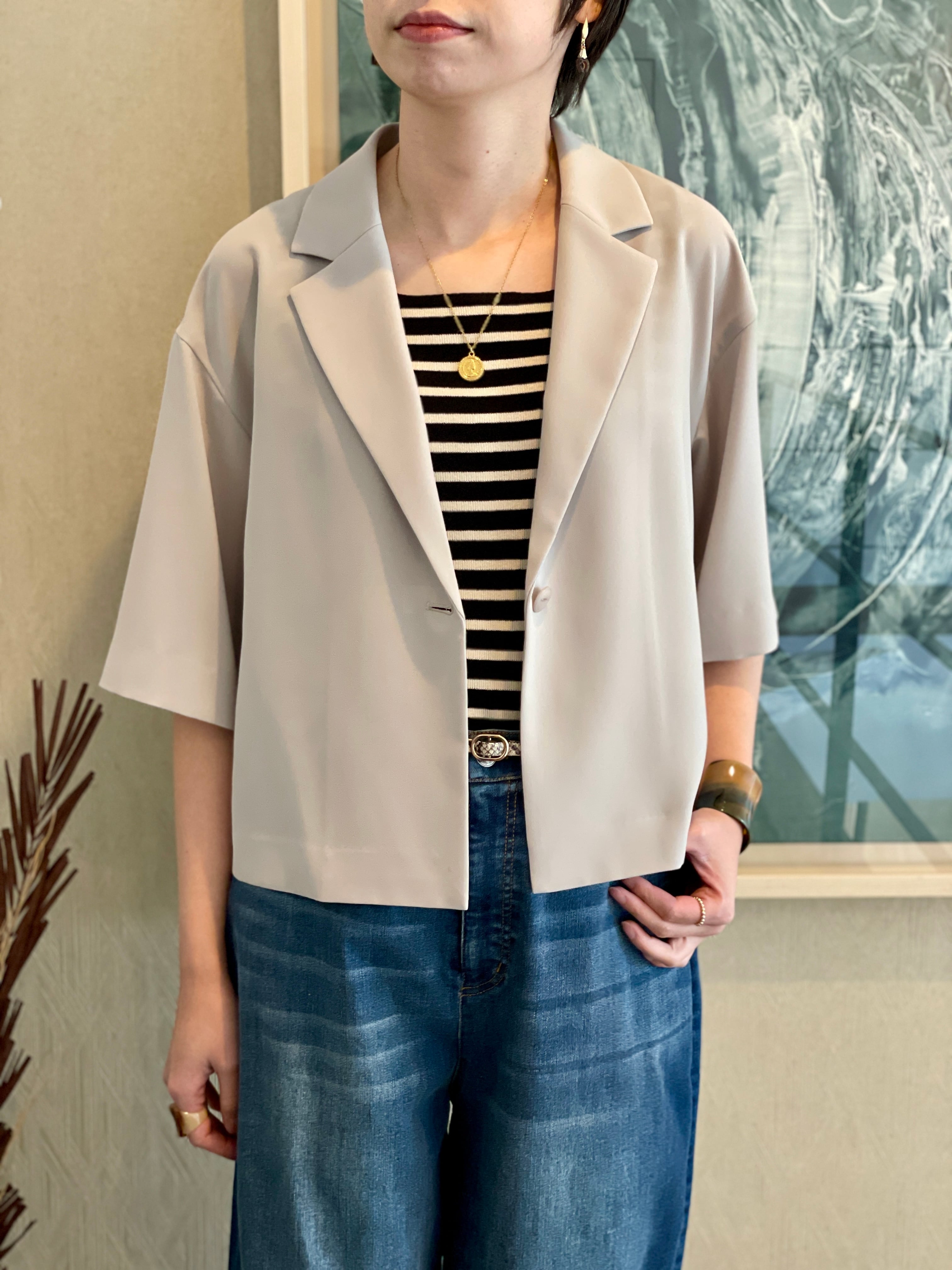 6部袖のテーラードショートジャケットです。
