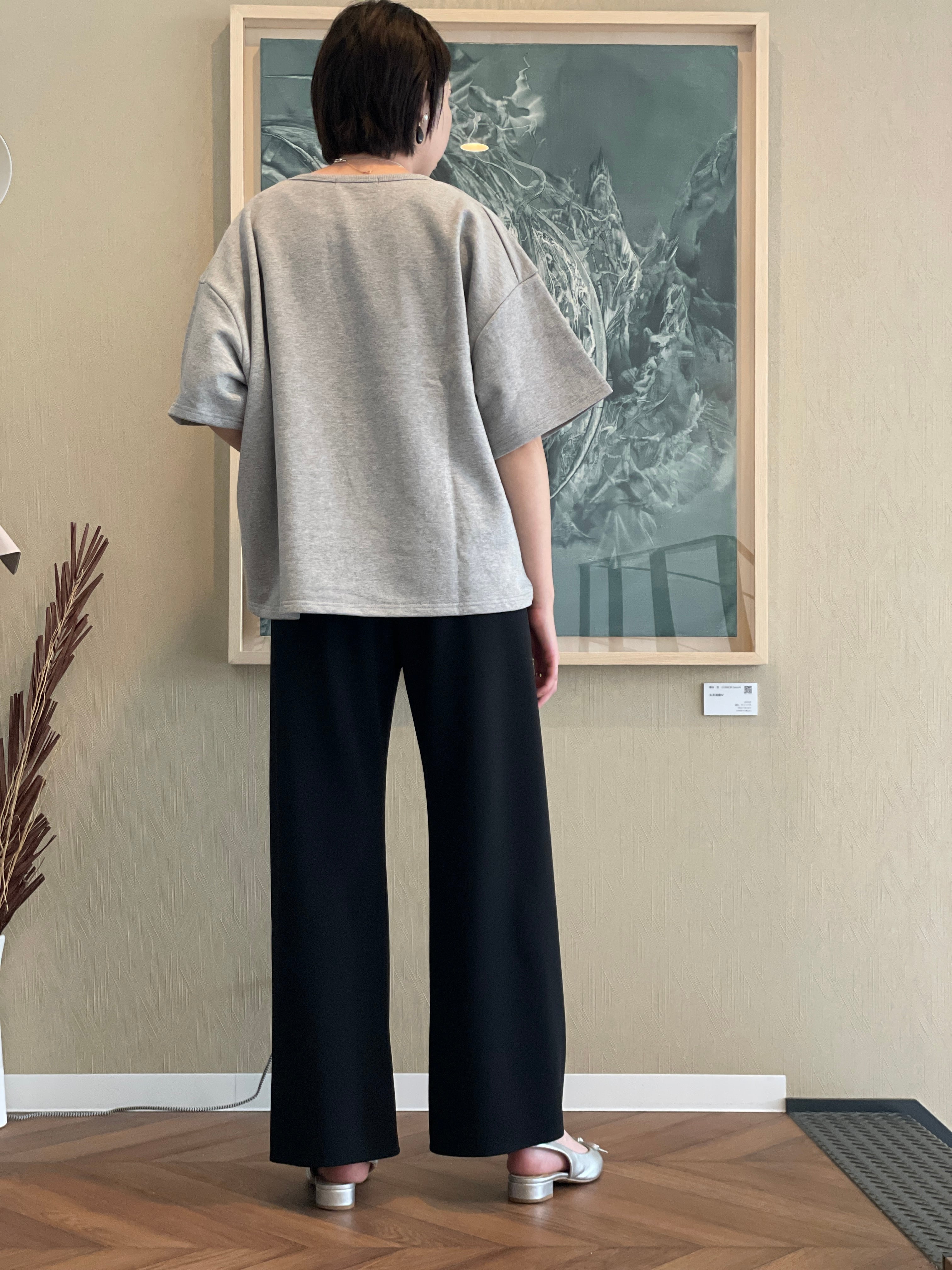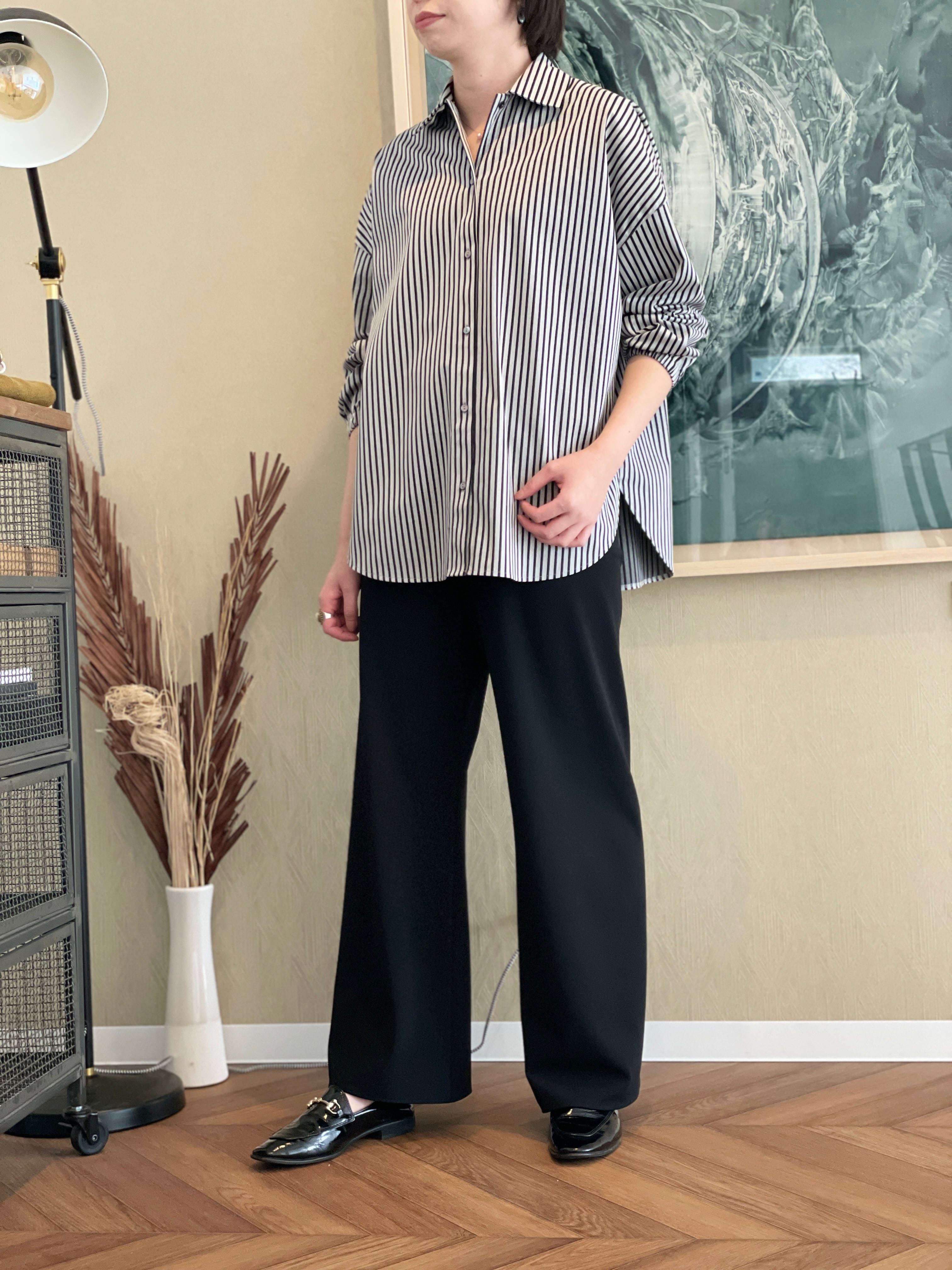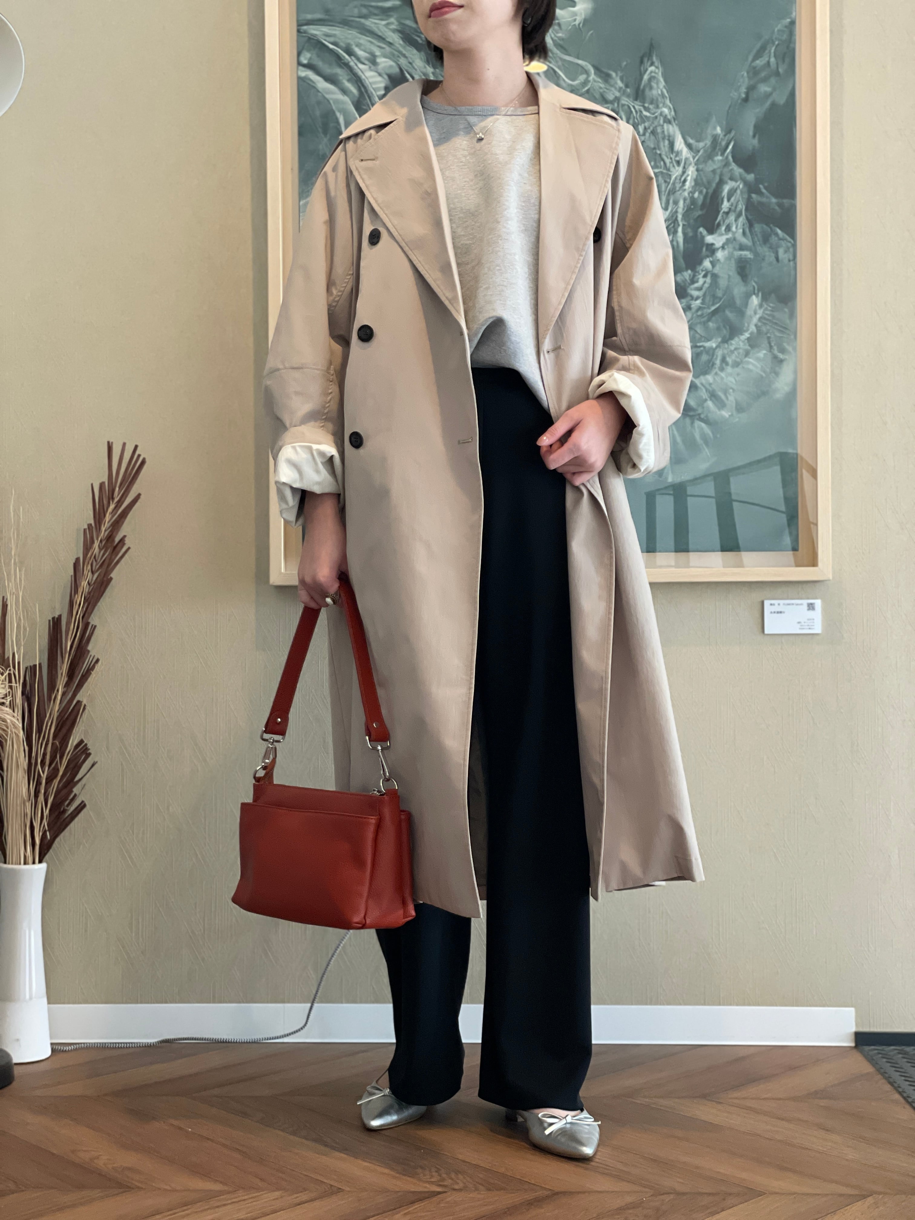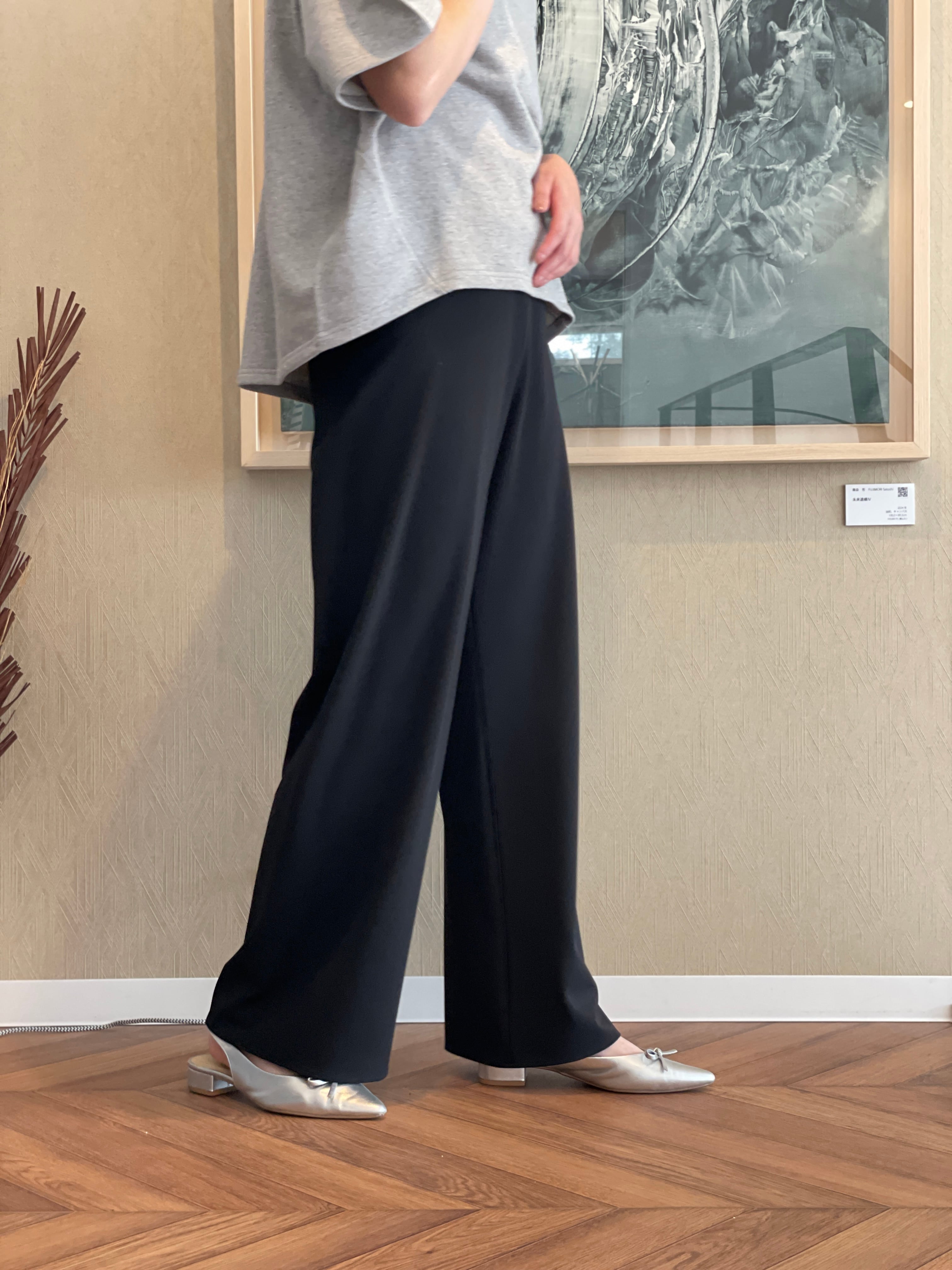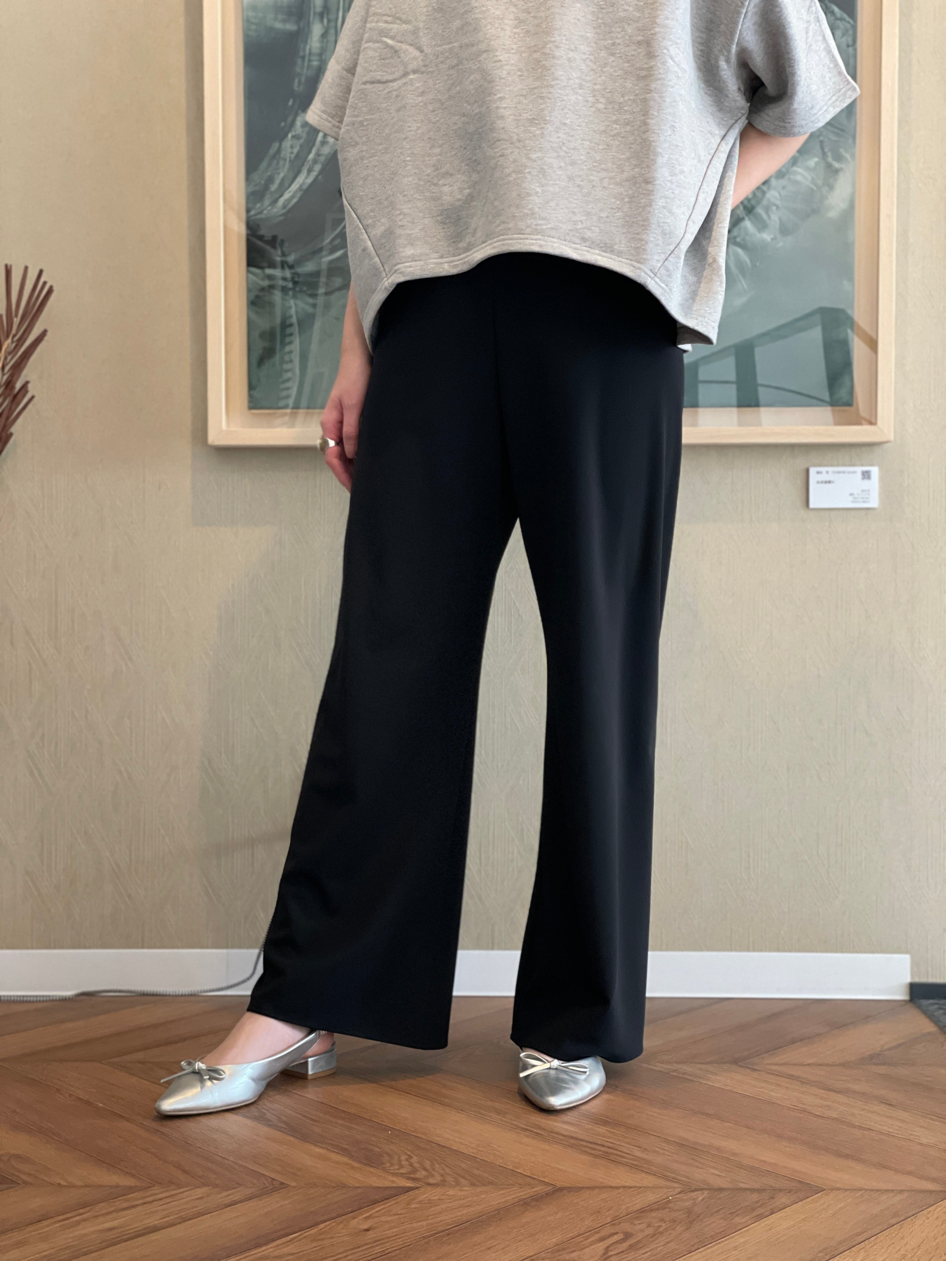 脚のラインを拾いすぎず、すっきりとした印象に仕上げてくれる一着になっています。