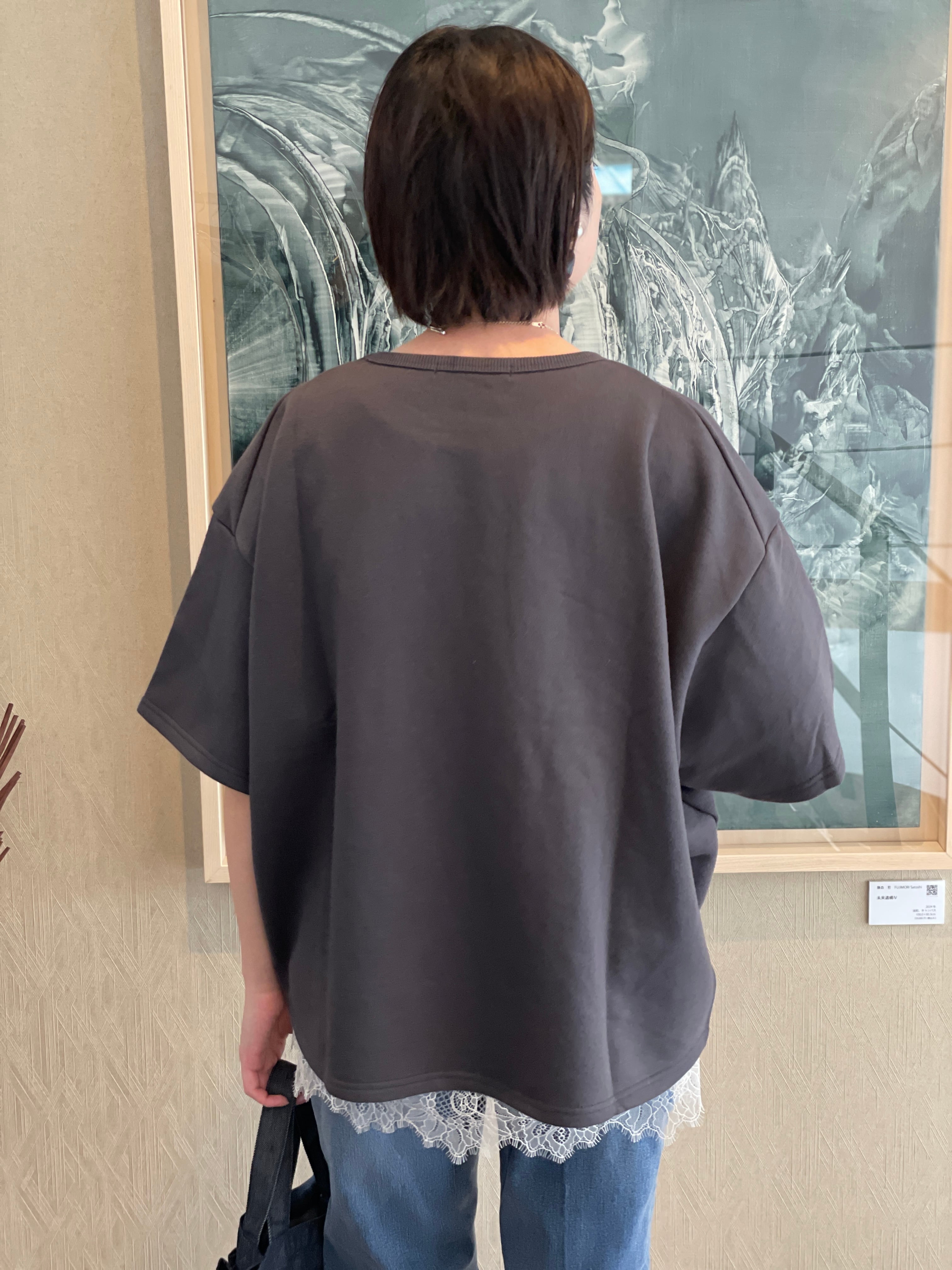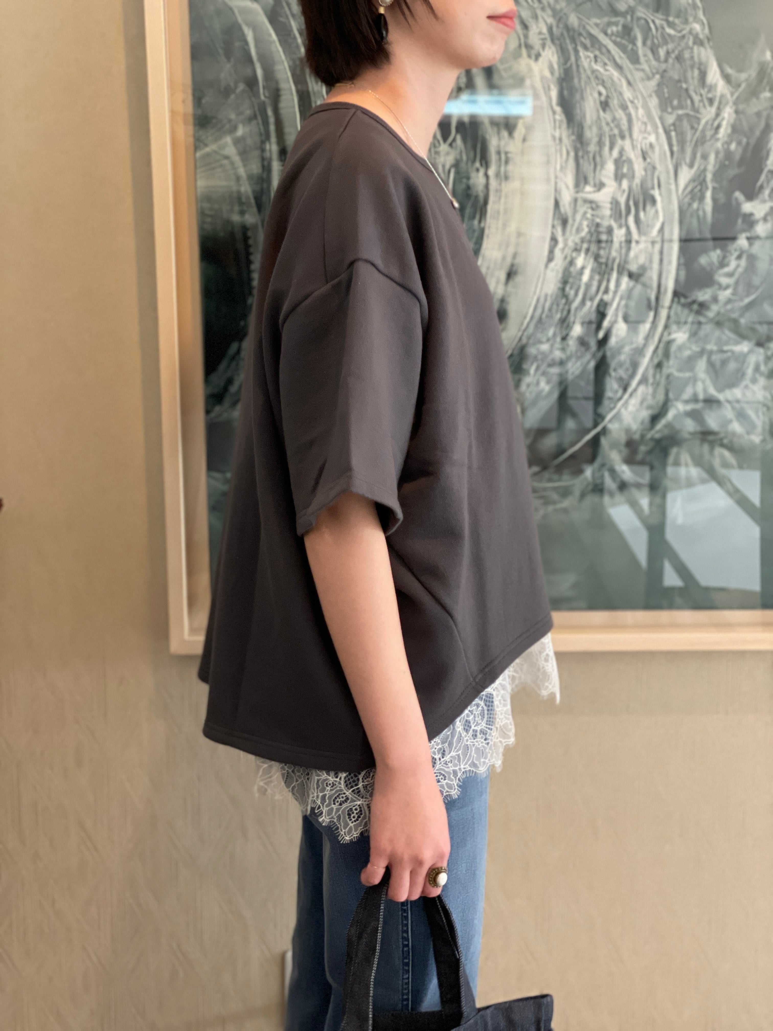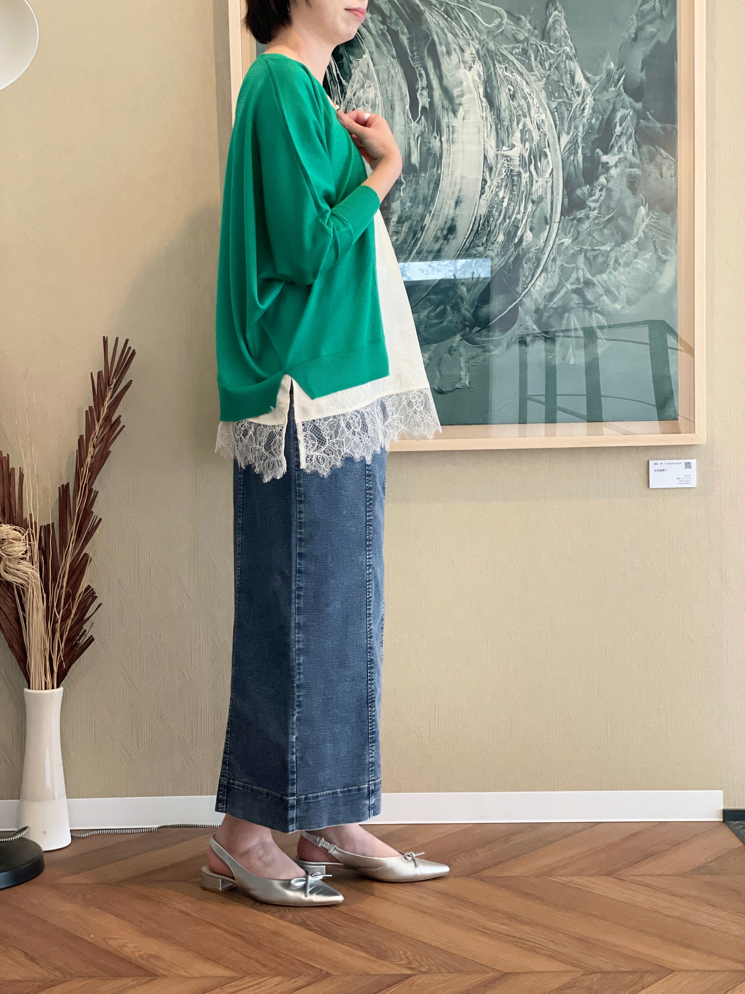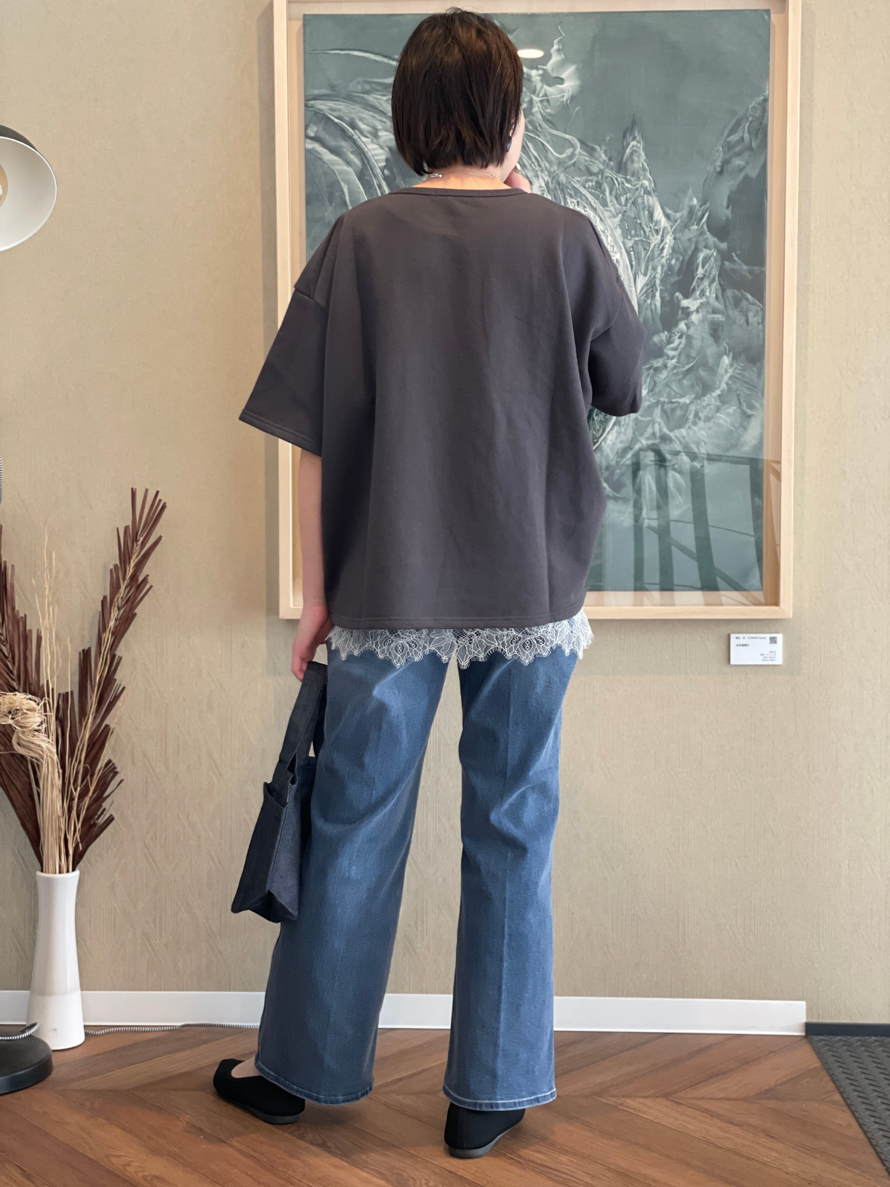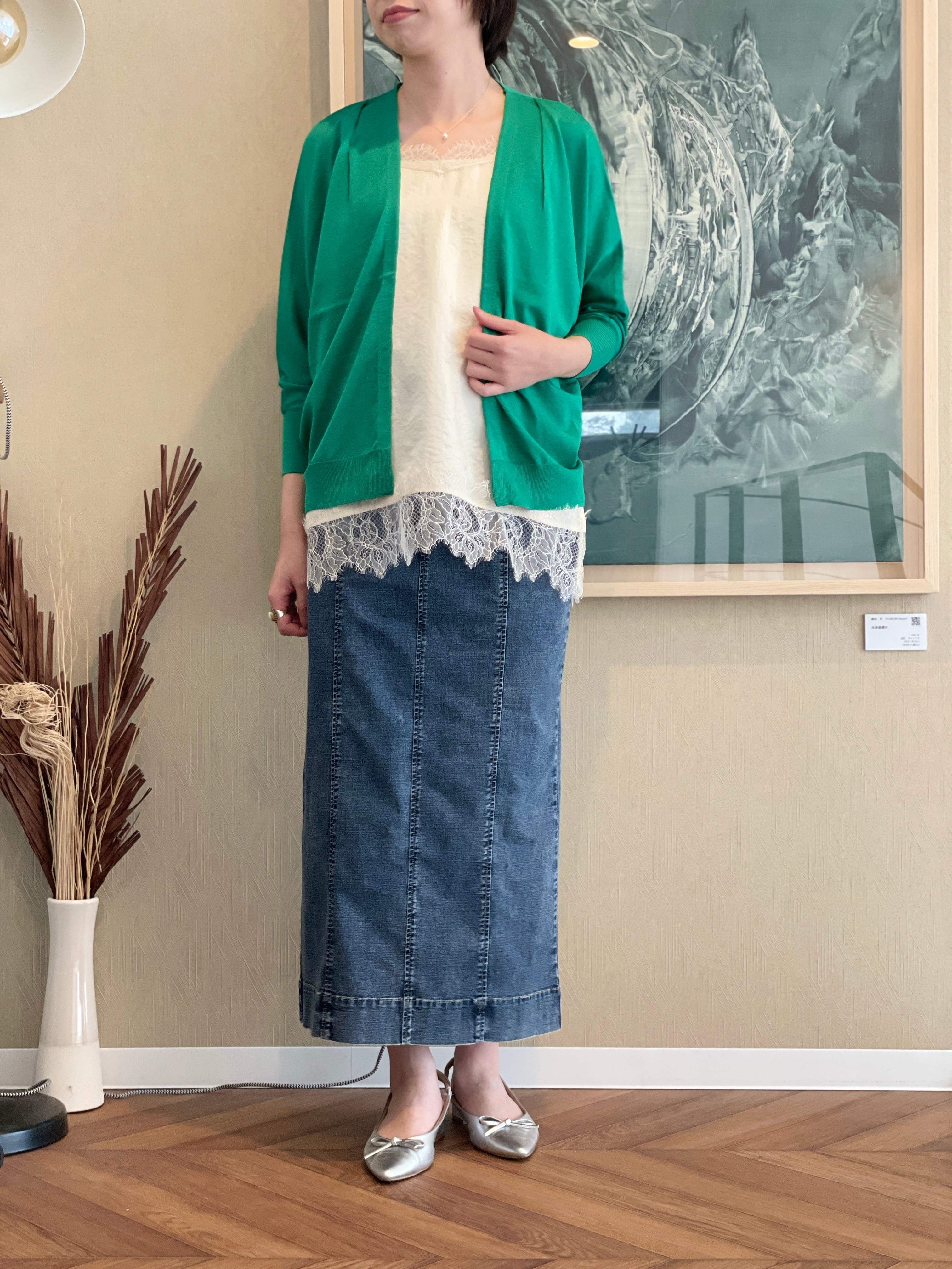 カットソーを合わせたスタイルはもちろん、